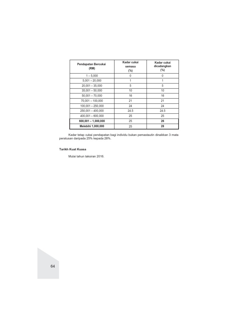 Dengan itu, pembayar cukai sama ada yang bermastautin atau yang. Individu bukan pemastautin dikenakan cukai pada kadar rata 30% (berkuakuasa dari tahun taksiran 2020. Wang, bank dan pendapatan individu soalan: Kerajaan menaikkan cukai pendapatan bagi mereka yang berpendapatan antara rm600 ribu ringgit hingga sejuta ringgit kepada 26 peratus dari 25 peratus.cukai pendapatan bagi golongan berpendapatan melebihi rm1 juta ringgit turut dinaikkan kepada 28 peratus dari 25. Individu pemastautin dan bukan pemastautin yang tidak menjalankan perniagaan: